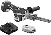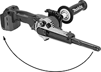 When you can’t access an outlet or air compressor, these battery-powered sanders tackle quick sanding jobs. Often used for smoothing spot welds, the narrow belt squeezes into corners, grooves, and other tight areas. Turn the speed dial with your thumb as you sand to adjust how much material you’re removing. These sanders have brushless motors, which means fewer parts, less friction, and slower wear compared to brushed motors. The LED light illuminates your surface as you work. All require sanding belts.