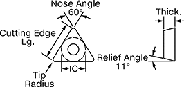 | Insert Code | Inscribed Circle Diameter (IC) | Thick. | Cutting Edge Lg. | Tip Radius | For Tool Bit Code | Each | Pkg. Qty. | Pkg. | ||