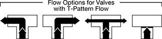 Valves with T-pattern flow can use any port as an inlet or an outlet. Turn the handle to direct flow from the inlet port to either outlet port at full capacity, direct flow to both outlet ports simultaneously at reduced capacity, or shut off flow completely.