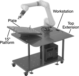 These stations are a portable working home for your robot arm. Roll them between jobs and lock the casters in place while working. Keep the work surface even by adjusting the leveling feet. A controller mount secures your controller beneath the arm, out of harm’s way but easy to access.
