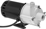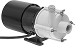 These pumps have a totally enclosed fan-cooled (TEFC) motor for use in dusty, dirty, and damp environments. The impeller is turned with magnets to eliminate seal wear and leakage for a long service life. Pumps are often used with electroplating and photographic solutions. They are gravity fed and require an elevated liquid source to fully fill the pump before turning on. Do not run dry or use with solids.