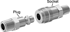 A complete coupling consists of a plug and a socket (both sold separately or in a set) that connect and disconnect quickly. Use them if you need frequent access to a line. They are also known as industrial interchange couplings. All Industrial plugs are compatible with any of the Industrial sockets of the same coupling size, regardless of the pipe size or barbed hose ID.