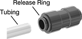 Also known as instant fittings, these chemical-resistant plastic fittings connect to tubing with a push. An internal gripping ring holds the tubing tight. To disconnect, push on the release ring and pull the tubing out of the fitting. Use these fittings in low-pressure applications.