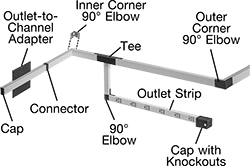 Mounting clips screw onto a wall. Snap the outlet strip or channel into the clip.