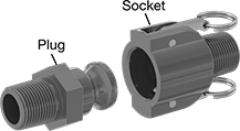 Made of polypropylene, these couplings are lighter in weight than metal cam-and-groove couplings and have good abrasion and corrosion resistance. A complete coupling consists of a plug and a socket (both sold separately) that allow you to quickly connect and disconnect medium-to large-diameter hose lines. To connect, insert the plug into the socket and press the levers down. The levers fit snugly into the groove on the plug’s body and force the plug against the gasket to form a tight seal. To disconnect, lift both levers and pull out the plug.