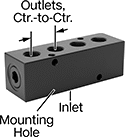 Unlike other manifolds, which have an inlet on either end, these have one inlet on the opposite side from the outlets. This design allows fluid or air to follow a straight path, improving flow through your system. It also frees up the ends of the manifold, so you can mount it in corners and in narrow spaces. Manifolds are also known as headers. They have mounting holes, so you can mount from the top or side.