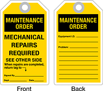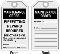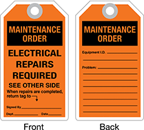 Tags are laminated in plastic so they hold up outdoors. Hang them on equipment in need of repairs using an included cable tie. Write on them using a pencil or permanent marker.