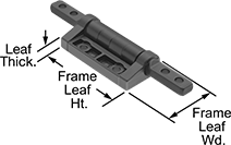 | Ht. | Wd. | Ht. | Wd. | O'all Wd. | Leaf Thick. | Range of Motion | Torque, in.-lbs. | Pin Dia. | Pin Material | Mounting Fasteners Included | No. of Mounting Holes | Mounting Hole Style | Mounting Screw Size | Each | ||