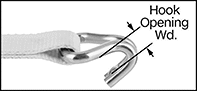 | Wd. | Max. Lg., ft. | Fixed End Lg. | Work Load Limit, lbs. | End Fitting Material | Hook Opening Wd. | Buckle Material | Max. Temp., °F | Color | Specifications Met | Each | |