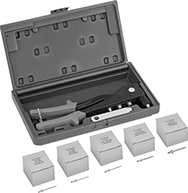 | 3/4" | 1" | 9 1/2" | Four nosepieces (3/32", 1/8", 5/32", and 3/16") 25 aluminum with steel mandrel domed rivets for 0.020”-0.125” thickness (3/16” dia.) 25 steel flush-mount rivets for 0.188”-0.250” thickness (1/8” dia.) 50 aluminum domed rivets for 0.063”-0.125” thickness (1/8” dia.) 50 steel domed rivets for 0.063”-0.125” thickness (1/8” dia.) 50 steel domed rivets for 0.188”-0.250” thickness (1/8” dia.) Plastic Case | 0000000 | 000000 |