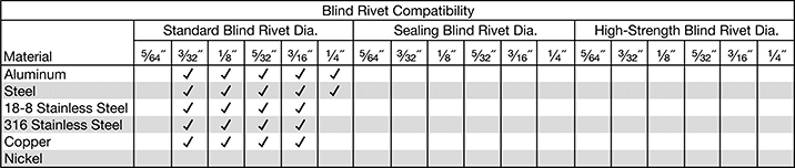 | For Rivet Dia. | For Rivet Material | Dia. | Lg. | Material | Includes | Each | |