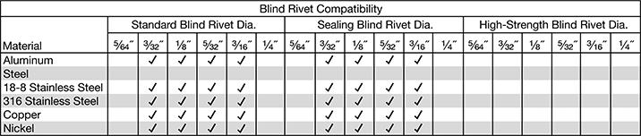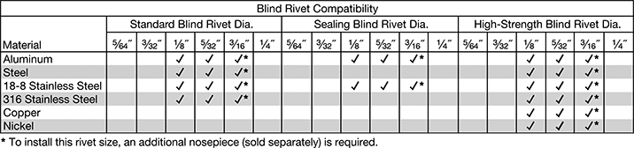 A blind rivet tool (sold separately) with a nosepiece that matches the rivet's diameter is required for installation.