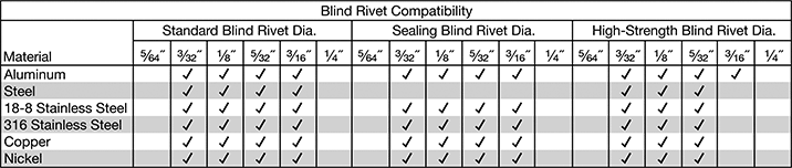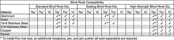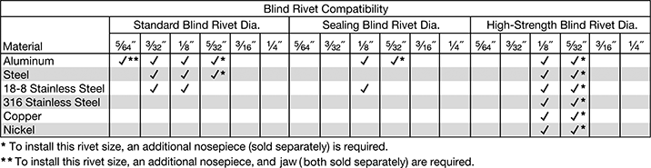 1,400-lb. pull capacity tool requires a 5/64" nosepiece and a 5/64" jaw (both sold separately) to install 5/64" dia. blind rivets. A 5/32" nosepiece (sold separately) is required to install 5/32" dia. blind rivets.