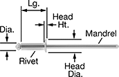 Dia. | For Material Thick. | Lg. | For Hole Size | For Drill Bit Size | Head Dia. | Head Ht. | Countersink Angle | Shear Strength, lbs. | Tensile Strength, lbs. | Mandrel Material | Specifications Met | Pkg. Qty. | Pkg. | |