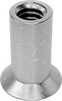 Made of 18-8 stainless steel, these rivet nuts withstand water, mild chemicals, and outdoor conditions better than zinc-plated steel nuts. A ribbed body grips surrounding material to hold them in place, keeping them from spinning as you tighten screws. Rivet nuts create permanent threads in sheet metal and other surfaces that are too thin to be tapped. They’re also known as blind inserts—installation requires access to just one side of your material. The flange distributes the load and holds them against the surface.