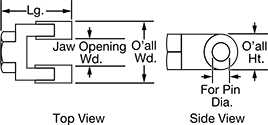 For Pin Dia. | Jaw Opening Wd. | Shank Center Lg. | Wd. | Lg. | Ht. | Thread Size | Gender | Threading | For Cylinder Mounting Pattern | Each | |