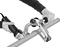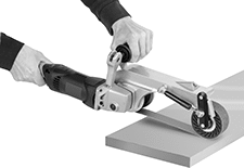 Sanders for workpiece diameters up to 14" are designed to contour to large diameters, such as pipes. A built-in damping mechanism helps the belt conform around your workpiece, so you don't have to press as hard, especially for large diameters. They have a contact wheel on the front, which is helpful for tough material removal, such as cleaning spot welds or removing deep scratches. When working overhead, there’s an additional handle you can install on the top of these sanders to maintain a steady grip.
