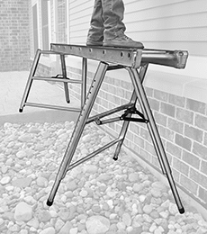 With a tripod base and adjustable legs, these stands help you create a stable, level work platform on stairs, slopes, and uneven ground. Pair with scaffold planks or stages. A pair holds up to 600 lbs. The legs adjust in 1 1/2" increments, so you can set each one to the exact height you need. Rubber feet keep them from slipping on smooth surfaces. Made of aluminum, these stands are lightweight and corrosion resistant. When your work is done, fold them flat and store them, or use the handle to carry them to another job.