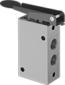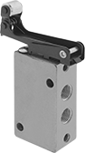 Often used to extend and then retract a cylinder at different speeds, these valves create two actions and have two exhaust ports, which allows you to control the speed of each action by attaching a flow control valve to each exhaust port. A simple automation solution that requires no programming, they activate when an object, such as a box rolling on a conveyor, pushes the actuator. They direct airflow from the inlet to your equipment and exhaust return airflow to create motion. Return actuation is by spring, so they go back to their original position as soon the actuator is released. Also known as 4-way and 5/2 valves.