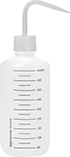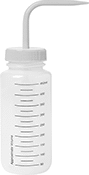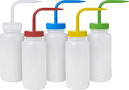 Labels allow identification at a glance. These bottles are also known as wash bottles and dispense liquid at a downward angle. For dispensing only; not recommended for storage.