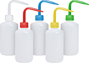 Also known as wash bottles, these dispense liquid at a downward angle. For dispensing only; not recommended for storage.
