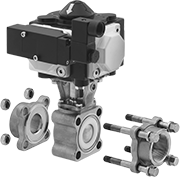 A 316 stainless steel body and a PTFE seal stand up to aggressive and corrosive solutions in chemical-processing applications. Their ball-valve design allows these valves to handle at least three times the flow of standard flanged valves. For faster actuation than motor-driven valves, they operate on compressed air. You must control the air to the actuator using either the included electric pilot valve or a manual on/off valve (not included). These valves automatically start and stop flow and don't require a minimum pressure drop between the inlet and outlet for operation.