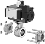 To maintain sanitary standards in food and beverage applications, these valves have sanitary quick-clamp connections and polished internal surfaces for easy cleaning. The three-piece bolted body comes apart for access to internal components without unthreading pipe connections and removing the valve from your line. They have a ball-valve design that provides higher flow rates than other air-driven valves. All operate on compressed air to automatically start and stop flow faster than motor-driven valves. You must control the air to the actuator using either an electric pilot valve or a manual on/off valve (not included). These valves do not require a minimum pressure drop between the inlet and the outlet for operation. All are full port, so they do not restrict flow.