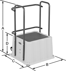 | Style | No. of Steps | Cap., lbs. | Ht. (A) | Wd. (B) | Dp. (C) | Ht. (D) | Wd. | Dp. | Wd. | Dp. | Wd. | Dp. | Assembled or Unassembled | Wheel Configuration | Color | Features | Each | Pkg. Qty. | Pkg. | ||