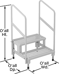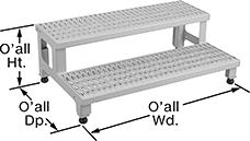 | Wd. | Dp. | Material | Ht. (A) | Wd. (B) | Dp. (C) | Wd. | Dp. | Step Material | Cap., lbs. | Wt., lbs. | Assembled or Unassembled | Features | Each | |