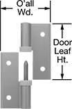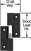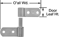 For Max. Door Wd. | Ht. | Wd. | Ht. | Wd. | O'all Wd. | Leaf Thick. | Range of Motion | Capacity, lbs. | Pin Dia. | Pin Material | Mounting Fasteners Included | No.of Mounting Holes | Mounting Screw Size | Choose an Offset | Each | |