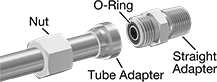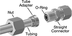A tube adapter sits flush against the flat face of the fitting so you can slide the tubing and fitting sideways to disconnect in cramped spaces. Fittings are also known as zero-clearance fittings. To install, weld a tube adapter to the tubing with a brazing ring (sold separately), then mate the tube adapter to the fitting and screw on the nut. As the nut is tightened, the tube adapter compresses the O-ring, creating a strong seal. Fittings are zinc-plated steel for fair corrosion resistance. Nuts and tube adapters are sold separately.