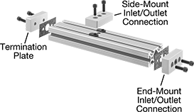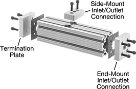 Pair inlet/outlet connections and termination plates to build your own manifold that uses the inside of T-slotted rail as a compressed air line. Inlet/outlet connections mount on the rail to create an inlet or outlet. For side-mount connections, drill a hole, then mount the connection with the included gasket and fasteners. To install end-mount connections, tap the existing holes in the rail, then mount the connection with the included gasket and screws. Termination plates seal the ends of the rails to maintain the air pressure. To install, tap the existing holes in the rail, then mount the plate with the included gasket and screws.