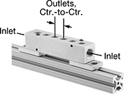 Block manifolds mount to T-slotted rails to distribute air, hydraulic fluid, or water. Use aluminum pipe plugs (sold separately) to close off unused ports.