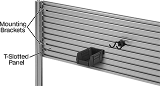 Mounting brackets for T-slotted panels mount panels flush with a rail. You can use them to mount a panel to create a wall or a tabletop. They’re static control, so they prevent electrostatic discharge from building up, protecting sensitive electronic equipment.