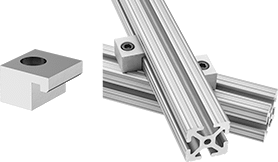 Miter concealed brackets connect rails with 45° or 90° miters. Slide them into the T-slots and tighten them in place with the included set screws.
