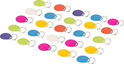 Oval, shamrock, and square tags have a spring snap that holds up to three standard-sized keys. Numbers are printed on one side.