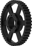 To prevent slippage while moving extra heavy loads, these pulleys mount with quick-disconnect (QD) bushings for a more secure grip on the shaft than set screws and press-fit pulleys. They are XXH (double extra heavy series) with trapezoidal teeth. Made from iron, these pulleys are strong and resistant wear. A black-oxide coating protects them from corrosion in dry environments.