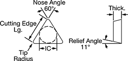 | Insert Code | Inscribed Circle Dia. (IC) | Tip Radius | Thick. | Cutting Edge Lg. | Rake Type | For Cutting Operation | Finish | Each | Pkg. Qty. | Pkg. | ||