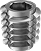 Also known as Tap-Lok inserts, these inserts cut their own threads in soft metals such as aluminum, so there’s no need to tap the hole. Their cutting teeth lock them into your material, so they won’t budge when you install or remove a screw. Thread the insert onto a bolt with two nuts before driving it into a drilled hole with a wrench. For repeated installation, use an installation tool with a ratchet wrench or insert the installation tool into a drill press. These inserts have a zinc plating, so they resist corrosion in wet environments.