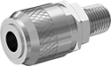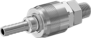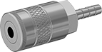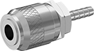 Plugs and sockets with a barbed end insert into plastic or rubber hose and secure with a clamp or a crimp-on hose ferrule.