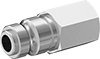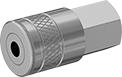 Sockets accommodate five common plug shapes: Industrial, ARO, Lincoln, Tru-Flate, and European. Use them with a plug of the same coupling size to frequently connect and disconnect your line. Sockets are push-to-connect style. To connect, push the plug into the socket until you hear a click. To disconnect, slide the sleeve on the socket forward until the plug ejects. Sockets have a shut-off valve that stops the flow when the coupling is separated, so air won’t leak from the line.