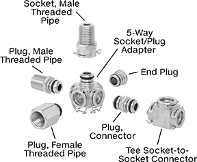 All plugs and sockets snap together with a latch and quickly disconnect when you press the latch down. This means you can reroute flow in your line with no hassle. Plugs secure with a Buna-N rubber O-ring to prevent vibrating and loosening. The O-ring also resists oil and water.