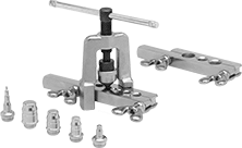 Mount these flarers in a vise and create single and double 37° and 45° flares. Use 37° flares in high-pressure applications and 45° flares in low-pressure applications. Double flares roll the end of tubing in on itself then flare both layers for applications such as brake lines. Type M hard copper should be annealed before flaring.