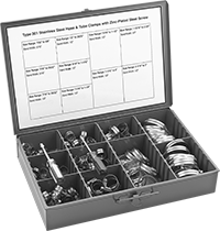 0.023" | -50° to 250° | Yes | SAE J1508 | 100 | Clamps with 5/16” band width, 7/32”-5/8” clamp ID range, SAE No. 4 (10 each) Clamps with 5/16” band width, 7/16”-25/32” clamp ID range, SAE No. 6 (10 each) Clamps with 1/2" band width, 7/16”-25/32” clamp ID range, SAE No. 6 (10 each) Clamps with 1/2" band width, 1/2”-29/32” clamp ID range, SAE No. 8 (10 each) Clamps with 1/2" band width, 9/16”-1 1/16” clamp ID range, SAE No. 10 (10 each) Clamps with 1/2" band width, 11/16”-1 1/4” clamp ID range, SAE No. 12 (10 each) Clamps with 1/2" band width, 13/16”-1 1/2” clamp ID range, SAE No. 16 (10 each) Clamps with 1/2" band width, 1 1/16”-2” clamp ID range, SAE No. 24 (10 each) Clamps with 1/2" band width, 1 13/16”-2 3/4” clamp ID range, SAE No. 36 (10 each) Clamps with 1/2" band width, 2 1/16”-3” clamp ID range, SAE No. 40 (10 each) 1/4" Hex Nutdriver 5/16" Hex Nutdriver Metal Box | 0000000 | 000000 |