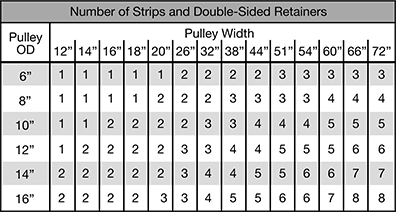 To Order: Check the chart or follow the 4 steps below to determine how many strips and retainers you’ll need to cover your pulley.