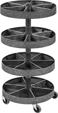 Each storage level rotates independently. Storage capacity is 35 lbs. for the top level, 50 lbs. for the second level, 60 lbs. for the third level, and 75 lbs. for the fourth level.