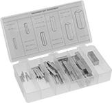 25 | 1/8" × 1/8" × 3/4" Lg. (2 Pieces) 1/8" × 1/8" × 1" Lg. (3 Pieces) 3/16" × 3/16" × 3/4" Lg. (3 Pieces) 3/16" × 3/16" × 1" Lg. (3 Pieces) 3/16" × 3/16" × 1 1/2" Lg. (2 Pieces) 1/4" × 1/4" × 3/4" Lg. (2 Pieces) 1/4" × 1/4" × 1" Lg. (3 Pieces) 1/4" × 1/4" × 1 1/4" Lg. (2 Pieces) 1/4" × 1/4" × 1 1/2" Lg. (1 Piece) 5/16" × 5/16" × 1" Lg. (1 Piece) 5/16" × 5/16" × 1 1/2" Lg. (1 Piece) 3/8" × 3/8" × 1" Lg. (1 Piece) 3/8" × 3/8" × 1 1/2" Lg. (1 Piece) | -0.002" to 0" | __ | 0000000 | 000000 |