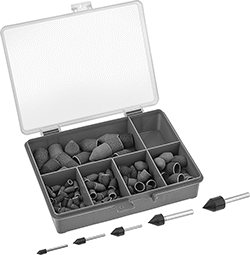 | Flat, Curved, Point | 285 | One of each shank for flat, curved, and point caps in these sizes (Head Dia. × Overall Lg.): 3/16" × 1 5/8" 9/32" × 1 3/4", 3/8" × 1 27/32", 1/2" × 2 5/16", 5/8" × 2 5/8" Six each of 60-, 150-, and 280-grit flat, curved, and point sanding caps in these sizes (Dia. × Lg.): 9/32" × 1/2", 3/8" × 5/8", 1/2" × 11/16", 5/8" × 1" Six each of 80-, 150-, and 280-grit flat, curved, and point sanding caps in this size (Dia. × Lg.): 3/16" × 3/8" | 12,000 | Aluminum Oxide | Cloth | Steel, Wood | Drills, Grinders for Bits and Burs | Plastic Compartmented Box | 00000000 | 000000 |