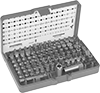 | 100 | 4 Adapters 96 Bits | Drilled Spanner: No. 4, No. 6, No. 8, No. 10, No. 12, 1/4" (1" O'all Lg.)—1 ea. Hex (Inch): 0.050", 1/16", 5/64", 3/32", 7/64", 1/8", 9/64", 5/32", 3/16", 7/32", 1/4", 5/16", 3/8" (1" O'all Lg.)—1 ea. Hex (Metric): 1.5 mm, 2 mm, 2.5 mm, 3 mm, 4 mm, 5 mm, 6 mm, 7 mm, 8 mm (1" O'all Lg.)—1 ea. Phillips: No. 0 (1" O'all Lg.)—1 ea. Phillips: No. 1, No. 3 (1" O'all Lg.)—2 ea. Phillips: No. 2 (1" O'all Lg.)—4 ea. Pozidriv®: No. 1, No. 2, No. 3 (1" O'all Lg.)—1 ea. Screw-In Hook Driver Bit—1 ea. Slotted: 3/32", 1/8", 5/32", 3/16", 7/32", 1/4", 9/32", 5/16", 3/8" (1" O'all Lg.)—1 ea. Square: No. 0, No. 1, No. 2, No. 3, No. 4 (1" O'all Lg.)—1 ea. Tamper-Resistant Hex (Inch): 3/32", 7/64", 1/8", 9/64", 5/32", 3/16", 7/32", 1/4", 5/16" (1" O'all Lg.)—1 ea. Tamper-Resistant Hex (Metric): 2.5 mm, 3 mm, 4 mm, 5 mm, 6 mm, 8 mm (1" O'all Lg.)—1 ea. Tamper-Resistant Torx: T6, T7, T8, T9, T10, T15, T20, T25, T27, T30, T40 (1" O'all Lg.)—1 ea. Torx: T5, T6, T7, T8, T9, T10, T15, T20, T25, T27, T30, T40, T45, T50, T55 (1" O'all Lg.)—1 ea. | 1/4" Male Square Drive × 1/4" Hex Shank Adapter (1" O'all Lg.) 1/4" Male Square Drive × 1/4" Hex Shank Adapter (2" O'all Lg.) 2 1/2" Lg. Bit Adapter for Power Tools Bit Adapter for Square Drive Tools | Steel | Plastic Case | 000000 | 000000 | ||||||||||||||||||||||||||||||||||||||||||||||||||||||||||||||||||||||||||||||||||||||||||||