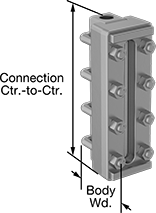 Glass Size | Connection Center-to-Center | Overall Height | Window Height | Body Width | Maximum Pressure | Temperature Range, °F | Each | Each | Each | Each | ||||